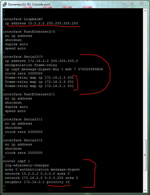 - R2(config-if)#frame-relay map ip 172.16.2.3 201 – обратите внимание, что все IP – адреса удаленных роутеров доступны через один и тот же DLCI (в отличие от настройки роутера R1). То есть, об удаленных роутерах (сетях) R2 будет получать информацию через R1;