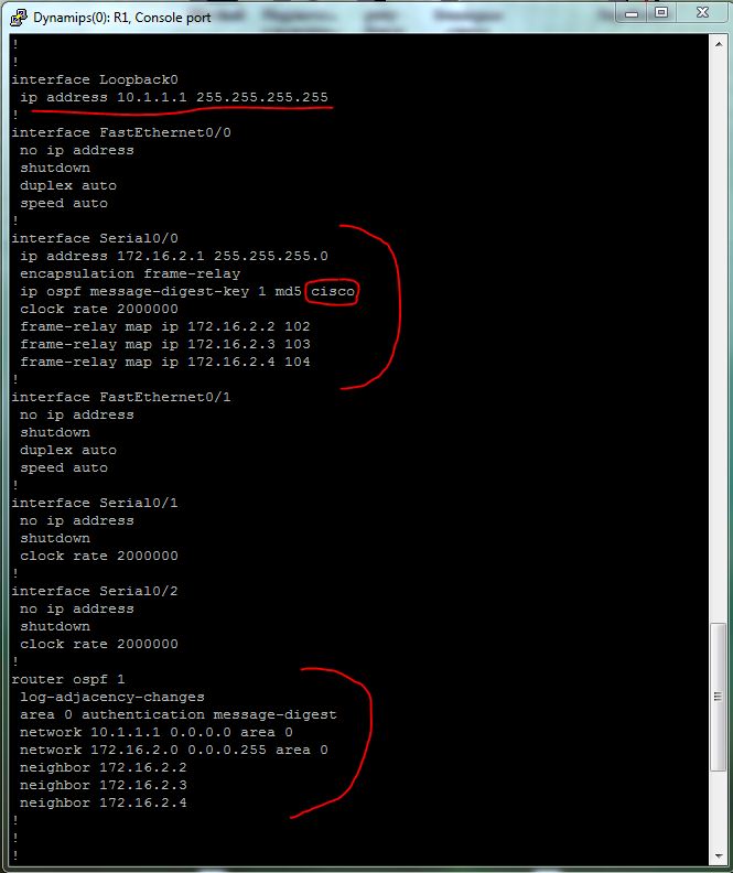 - R1(config-router)#area 0 authentication message-digest – включаем аутентификацию с md5 в OSPF;