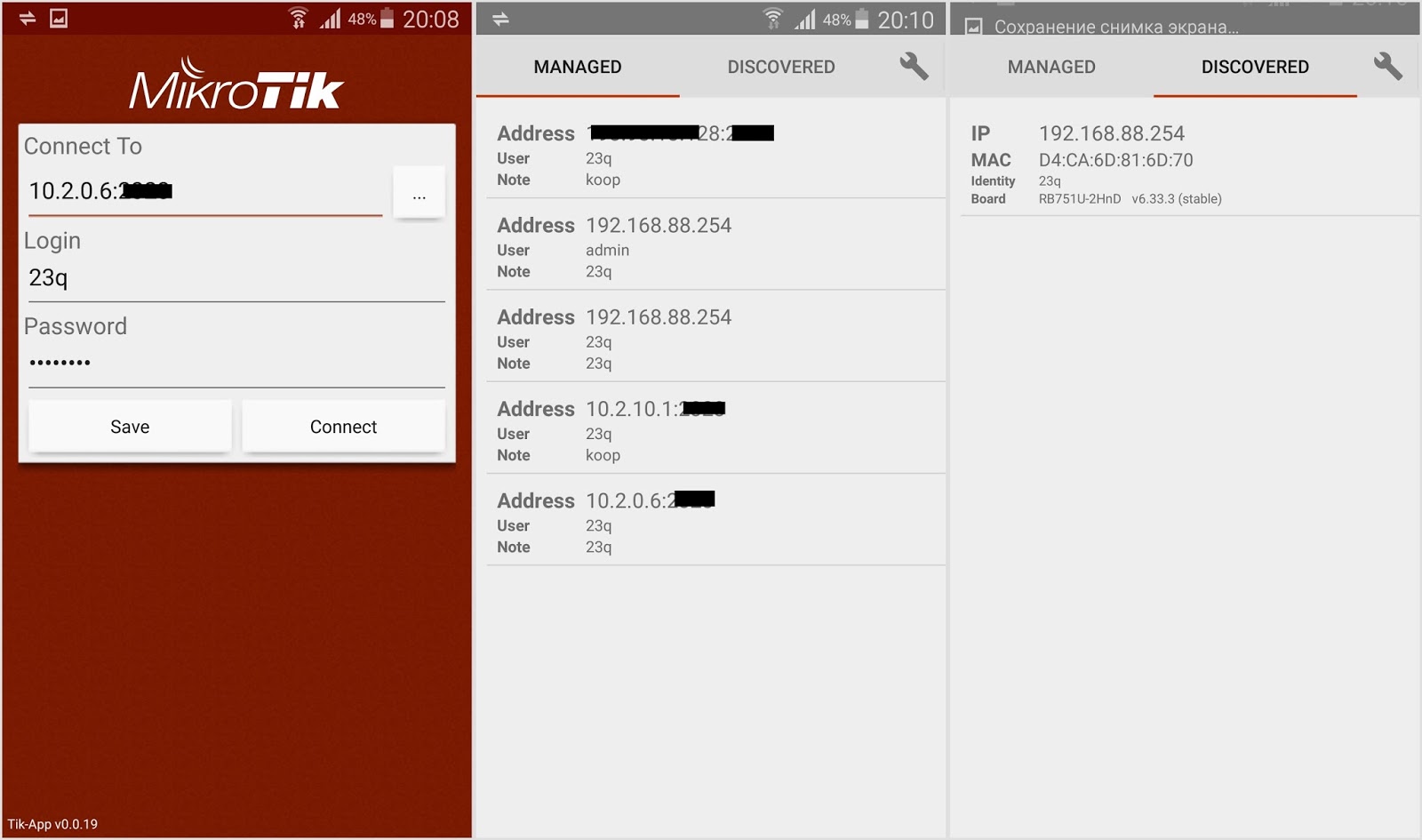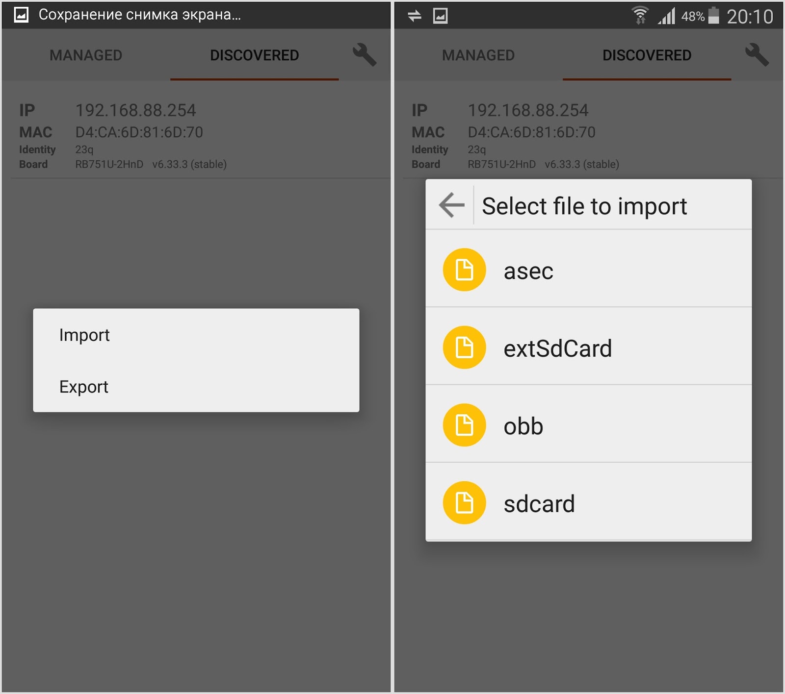 «…» переходим в окно выбора MANAGER — сохраненные профили подключения наших устройств. Окно DISCOVER аналог Neighbors в WinBox. При нажатии на гаечный ключ выпадает меню импорта и экспорта профилей подключений: